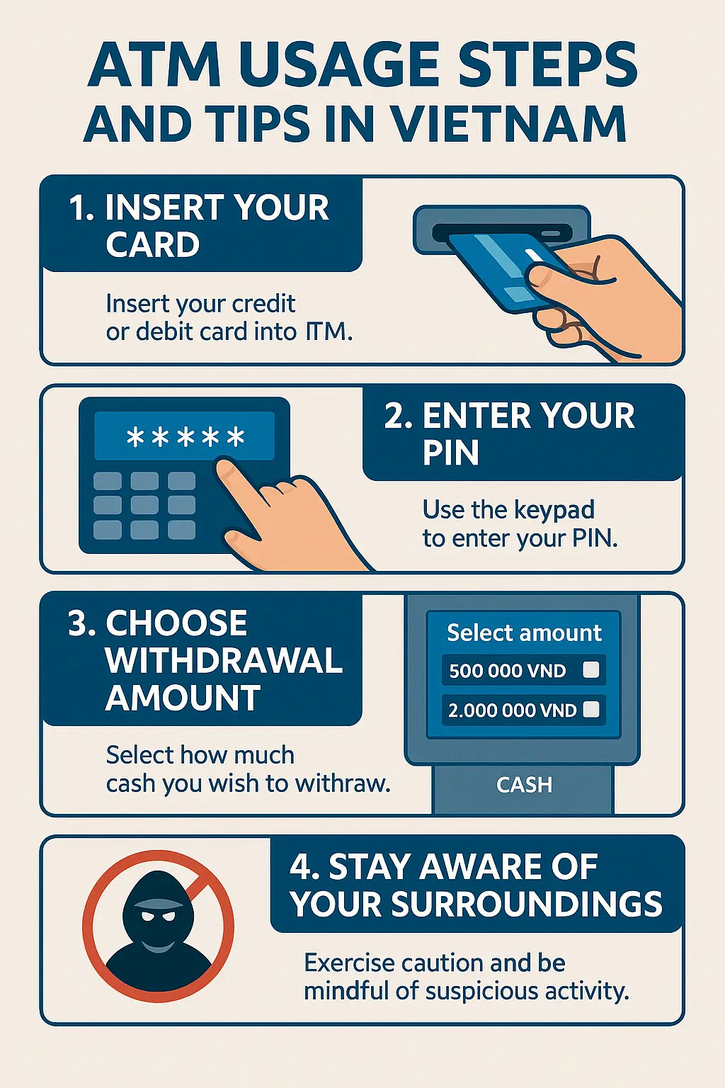 무엇보다 중요한 것은 항상 VND로 인출하고, DCC를 거절하며, 기기 주변을 안전하게 확인하는 것입니다. 베트남의 ATM 환경은 점점 개선되고 있으므로, 올바른 사용법만 지키면 수수료 걱정 없이 편리하게 현금을 인출할 수 있습니다.
